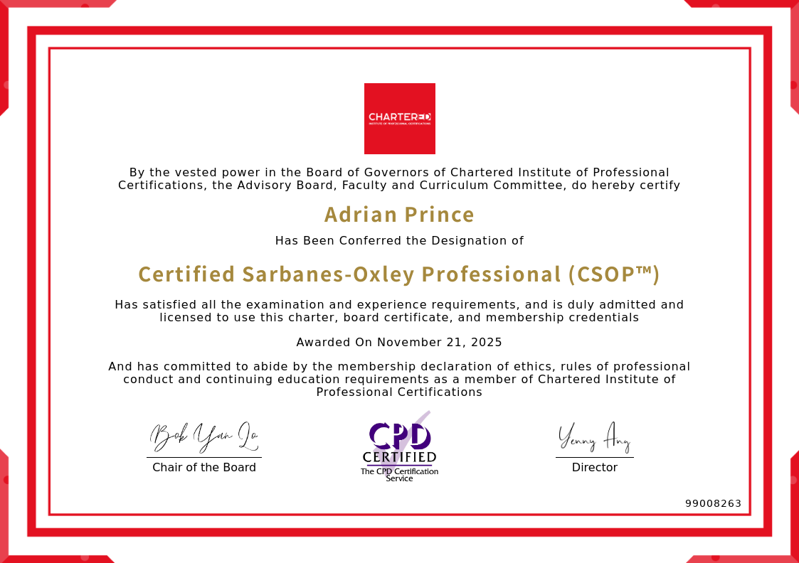 The certificate above verifies that Adrian Prince successfully satisfied all the exam and experience requirements and is duly admitted and licensed to use this Charter Certified Sarbanes-Oxley Professional (CSOP™), board certificate.