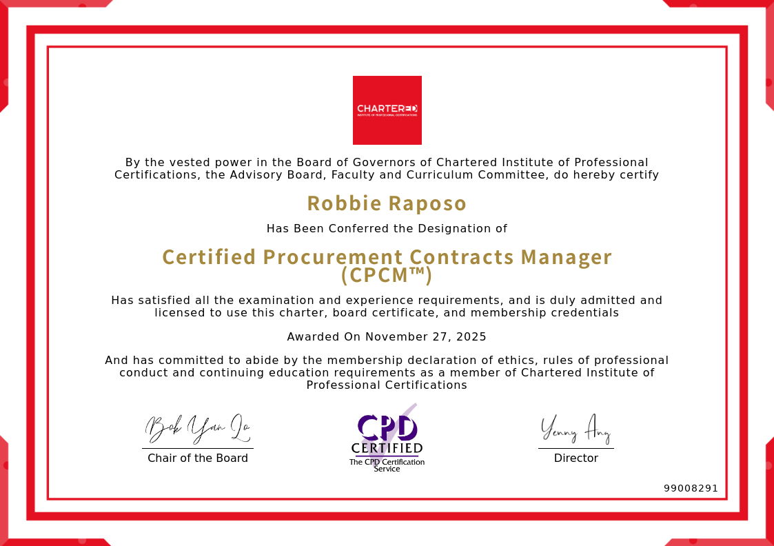 The certificate above verifies that Robbie Raposo successfully satisfied all the exam and experience requirements and is duly admitted and licensed to use this Charter Certified Procurement Contracts Manager (CPCM™), board certificate.