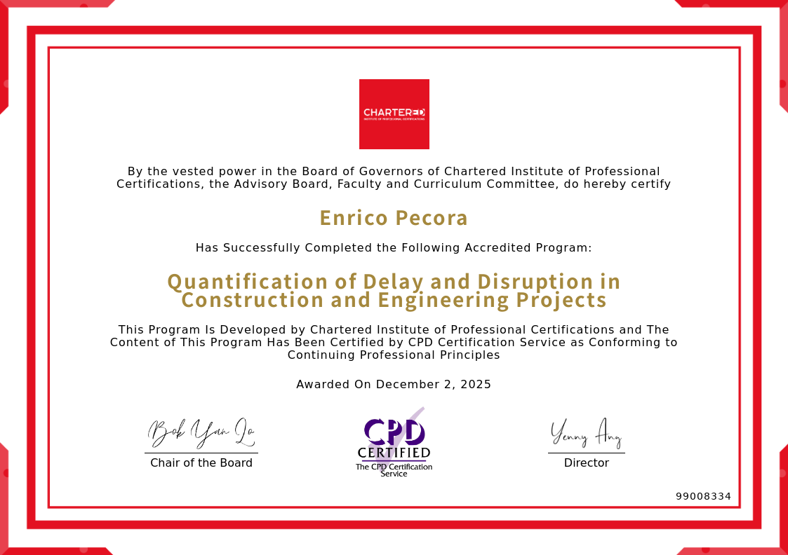 The certificate above verifies that Enrico Pecora successfully completed the accredited program: Quantification of Delay and Disruption in Construction and Engineering Projects.