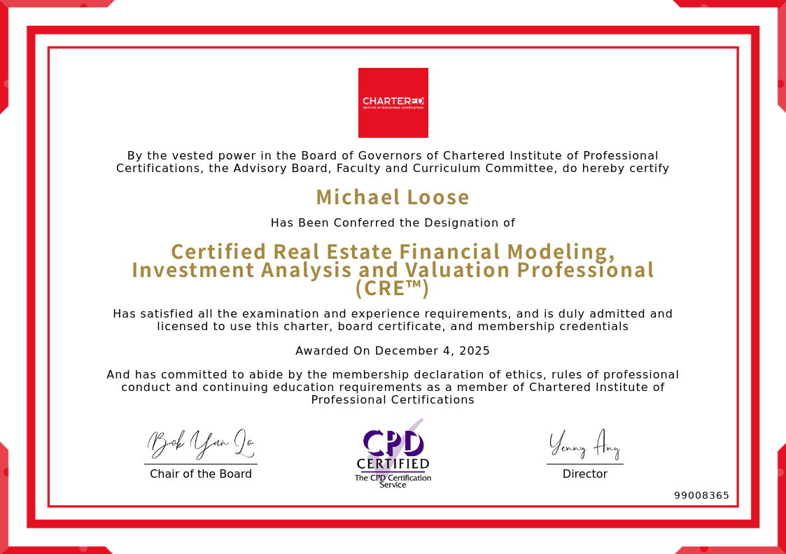 The certificate above verifies that Michael Loose successfully satisfied all the exam and experience requirements and is duly admitted and licensed to use this Charter Certified Real Estate Financial Modeling, Investment Analysis and Valuation Professional (CRE™), board certificate.
