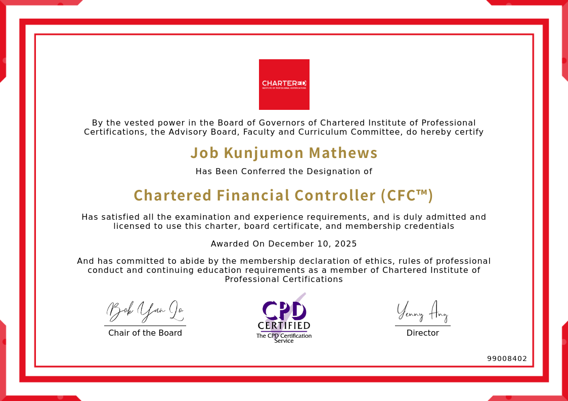 The certificate above verifies that Job Kunjumon Mathews successfully satisfied all the exam and experience requirements and is duly admitted and licensed to use this Charter Chartered Financial Controller (CFC™), board certificate.
