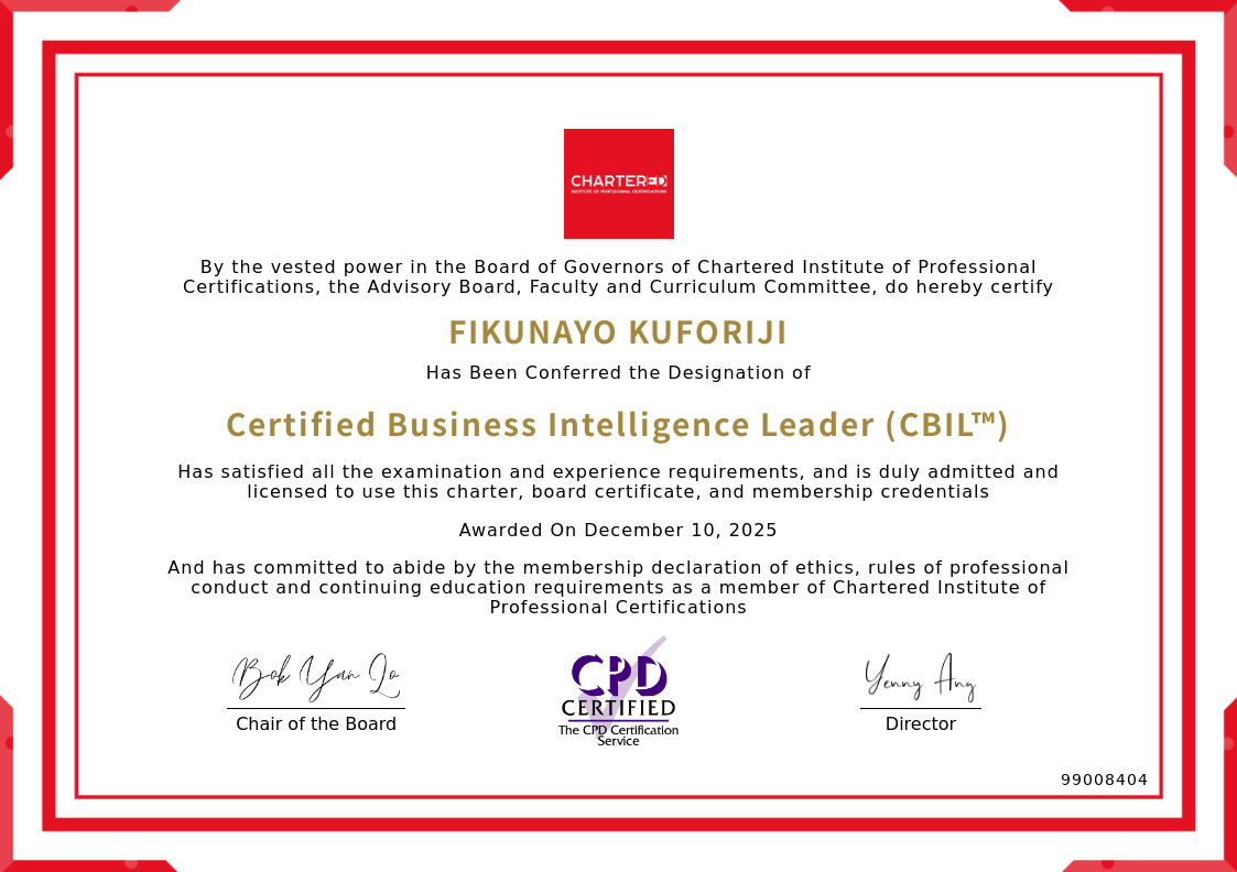 The certificate above verifies that FIKUNAYO KUFORIJI successfully satisfied all the exam and experience requirements and is duly admitted and licensed to use this Charter Certified Business Intelligence Leader (CBIL™), board certificate.