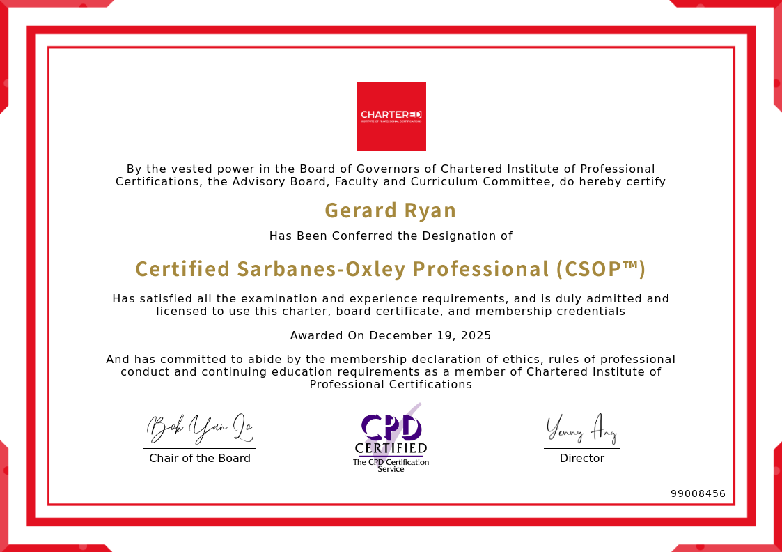 The certificate above verifies that Gerard Ryan successfully satisfied all the exam and experience requirements and is duly admitted and licensed to use this Charter Certified Sarbanes-Oxley Professional (CSOP™), board certificate.