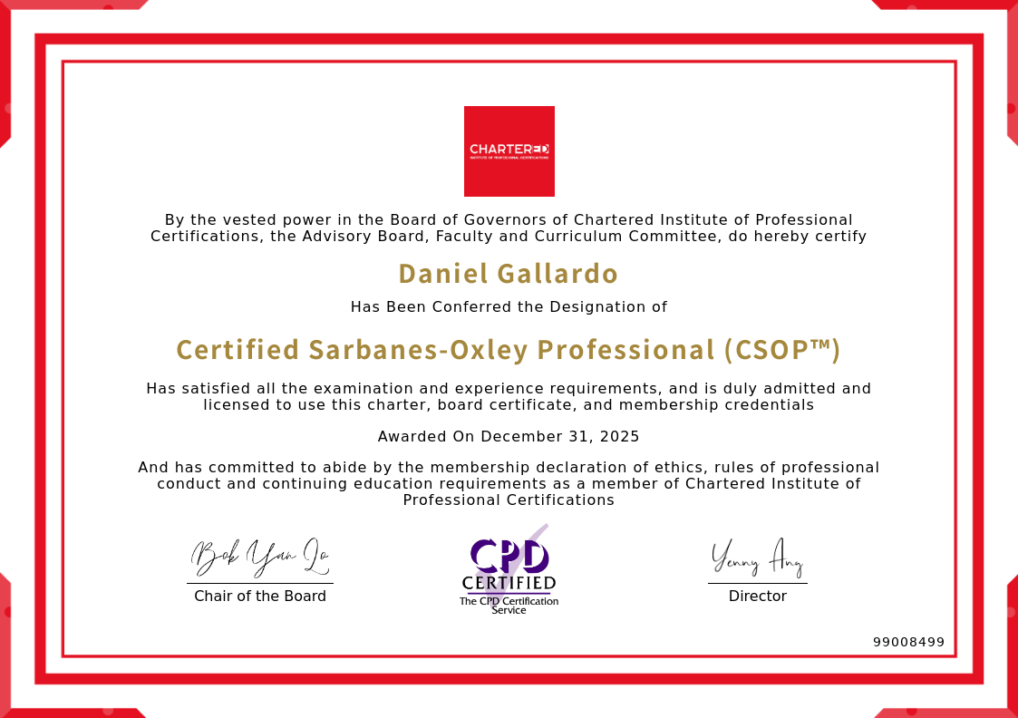 The certificate above verifies that Daniel Gallardo successfully satisfied all the exam and experience requirements and is duly admitted and licensed to use this Charter Certified Sarbanes-Oxley Professional (CSOP™), board certificate.