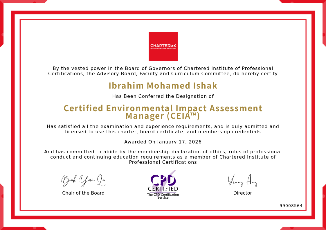 The certificate above verifies that Ibrahim Mohamed Ishak successfully satisfied all the exam and experience requirements and is duly admitted and licensed to use this Charter Certified Environmental Impact Assessment Manager (CEIA™), board certificate.