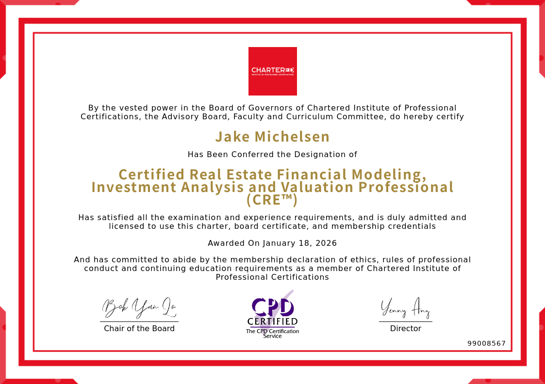 The certificate above verifies that Jake Michelsen successfully satisfied all the exam and experience requirements and is duly admitted and licensed to use this Charter Certified Real Estate Financial Modeling, Investment Analysis and Valuation Professional (CRE™), board certificate.