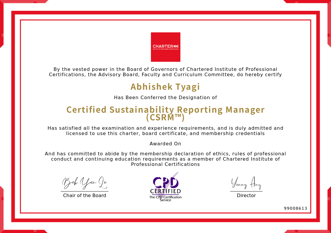 The certificate above verifies that Abhishek Tyagi successfully satisfied all the exam and experience requirements and is duly admitted and licensed to use this Charter Certified Sustainability Reporting Manager (CSRM™), board certificate.