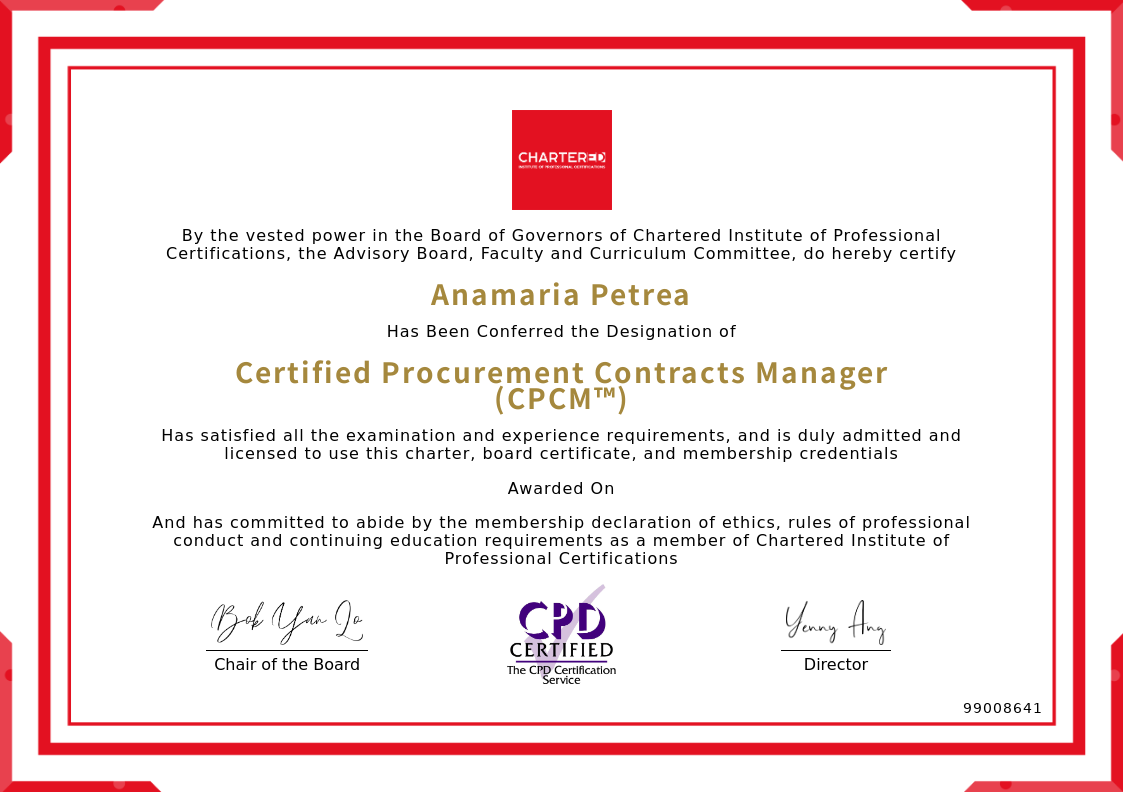 The certificate above verifies that Anamaria Petrea successfully satisfied all the exam and experience requirements and is duly admitted and licensed to use this Charter Certified Procurement Contracts Manager (CPCM™), board certificate.