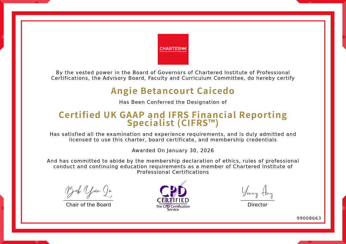 The certificate above verifies that Angie Betancourt Caicedo successfully satisfied all the exam and experience requirements and is duly admitted and licensed to use this Charter Certified UK GAAP and IFRS Financial Reporting Specialist (CIFRS™), board certificate.