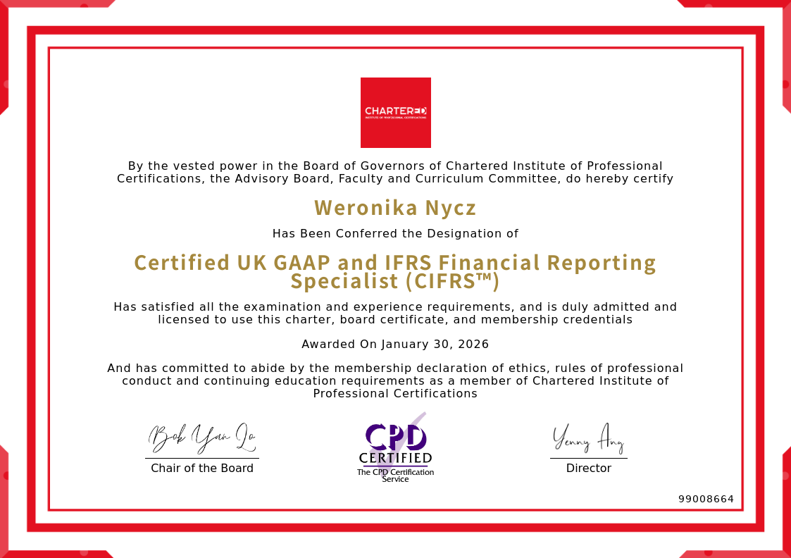 The certificate above verifies that Weronika Nycz successfully satisfied all the exam and experience requirements and is duly admitted and licensed to use this Charter Certified UK GAAP and IFRS Financial Reporting Specialist (CIFRS™), board certificate.