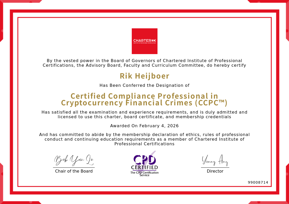 The certificate above verifies that Rik Heijboer successfully satisfied all the exam and experience requirements and is duly admitted and licensed to use this Charter Certified Compliance Professional in Cryptocurrency Financial Crimes (CCPC™), board certificate.