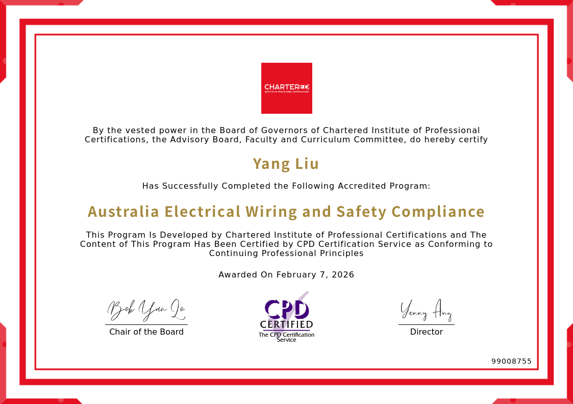 The certificate above verifies that Yang Liu successfully completed the accredited program: Certified Australia Electrical Wiring Standards and Safety Compliance.
