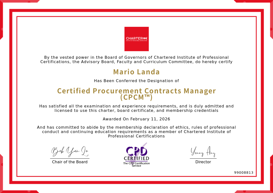 The certificate above verifies that Mario Landa successfully satisfied all the exam and experience requirements and is duly admitted and licensed to use this Charter Certified Procurement Contracts Manager (CPCM™), board certificate.
