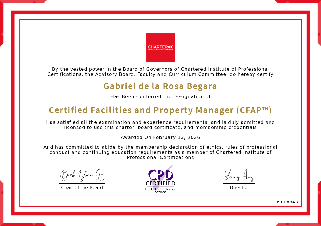 The certificate above verifies that Gabriel de la Rosa Begara successfully satisfied all the exam and experience requirements and is duly admitted and licensed to use this Charter Certified Facilities and Property Manager (CFAP™), board certificate.