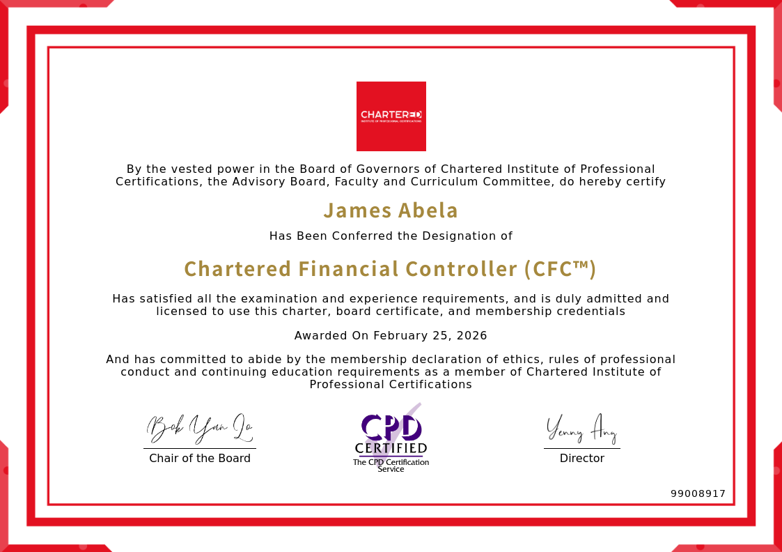 The certificate above verifies that James Abela successfully satisfied all the exam and experience requirements and is duly admitted and licensed to use this Charter Chartered Financial Controller (CFC™), board certificate.