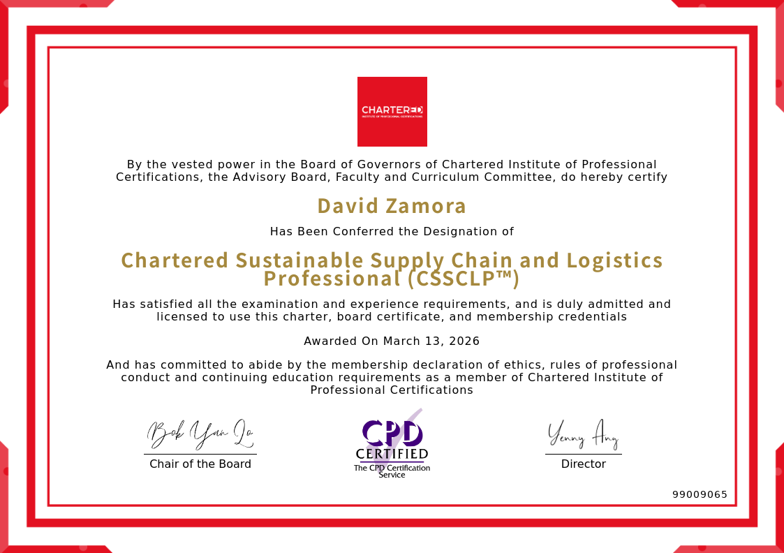 The certificate above verifies that David Zamora successfully satisfied all the exam and experience requirements and is duly admitted and licensed to use this Charter Chartered Sustainable Supply Chain and Logistics Professional (CSSCLP™), board certificate.