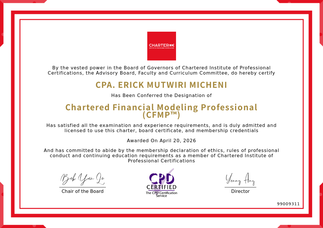 The certificate above verifies that CPA. ERICK MUTWIRI MICHENI successfully satisfied all the exam and experience requirements and is duly admitted and licensed to use this Charter Chartered Financial Modeling Professional (CFMP™), board certificate.