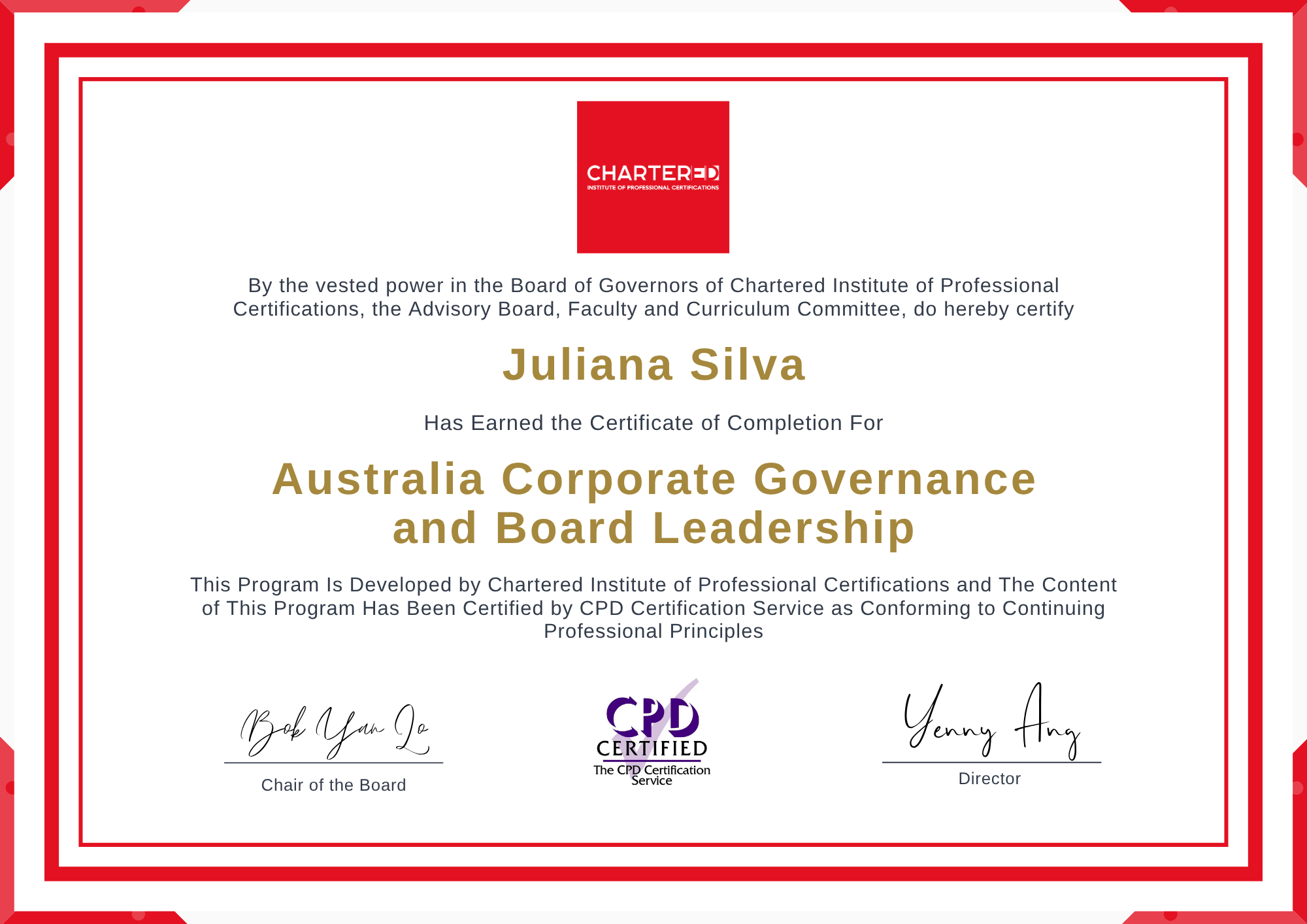 Globally demanded and recognized, this certification will position you as a governance-ready professional with a clear understanding of directors’ duties, liability frameworks, and modern board practices. It enhances your credibility with boards, regulators, and employers, supports your leadership ambitions, and demonstrates your commitment to high-integrity, value-driven governance in complex, accountability-focused environments. Developed by Chartered Institute of Professional Certifications, the content of this program has been independently accredited by CPD Certification Service as adhering to the highest standards of continuing professional principles.