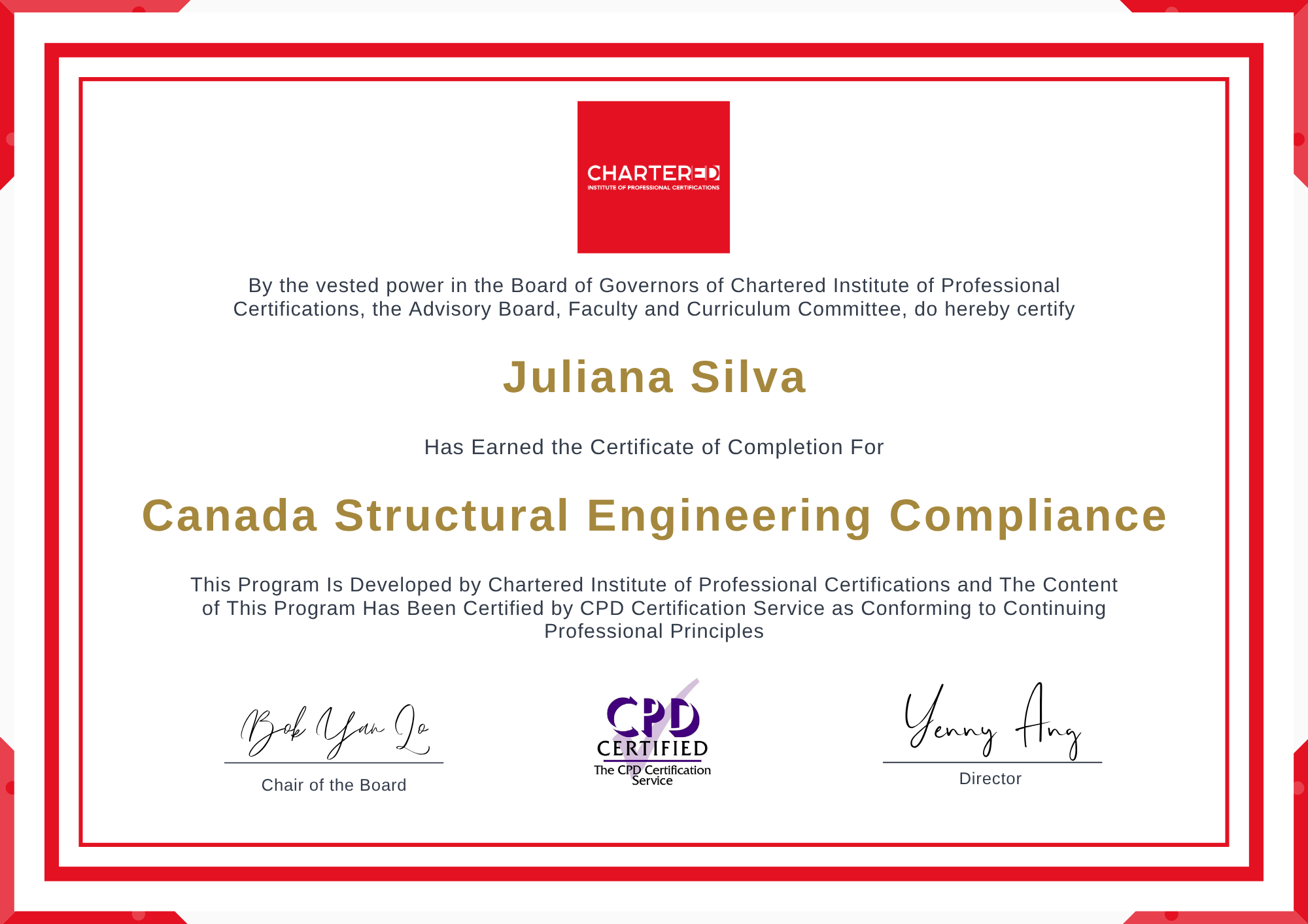 Globally demanded and recognized, this certification will amplify your professional qualifications and demonstrate your expertise in structural analysis, load assessment, and the application of national building codes to ensure safe, compliant, and high-performance structures. Developed by Chartered Institute of Professional Certifications, the content of this program has been independently accredited by CPD Certification Service as adhering to the highest standards of continuing professional principles.