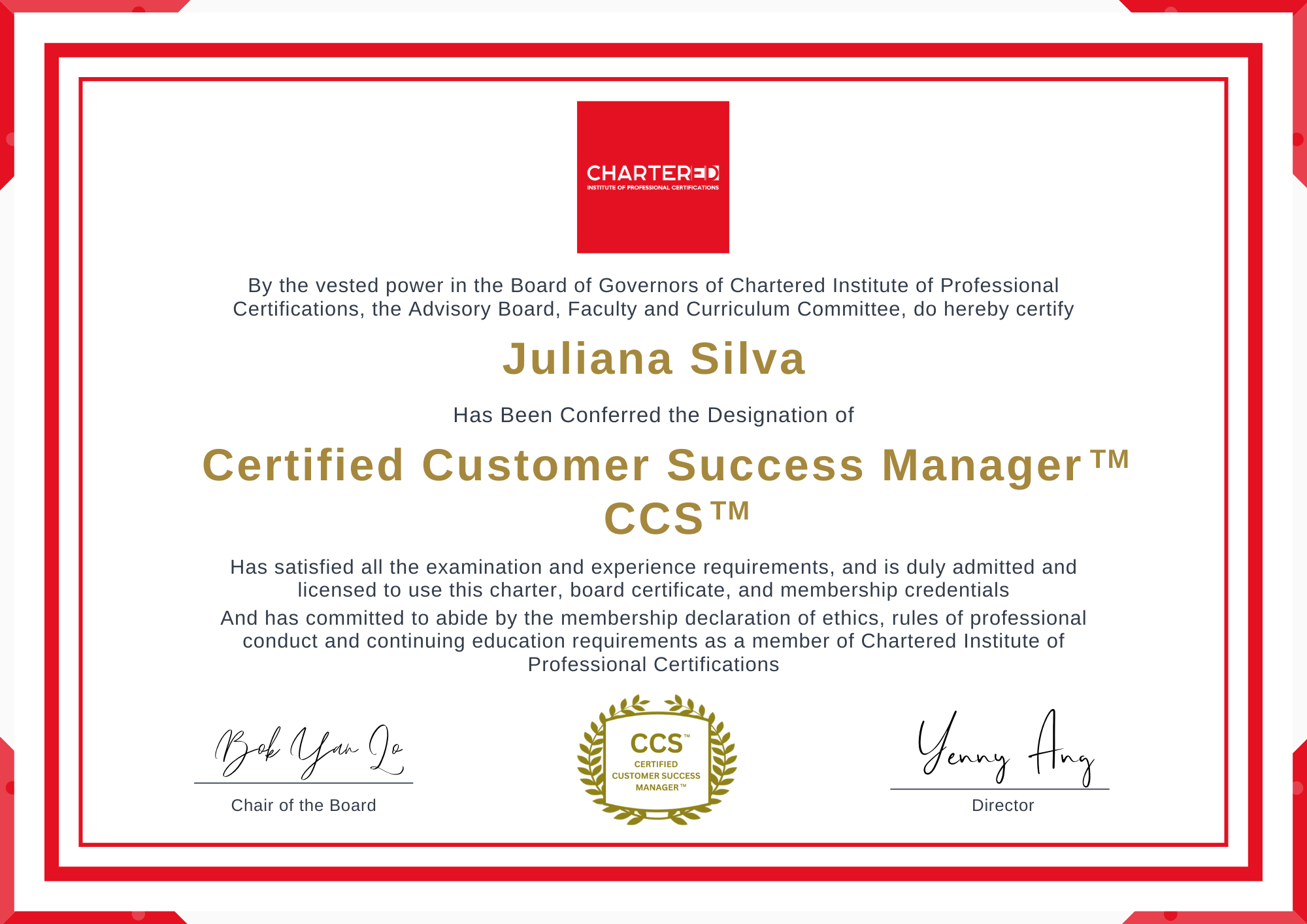 Globally recognized, the CCS™ certification affirms your expertise in managing customer success as a structured, data-driven, and outcome-focused business function. It demonstrates your ability to design effective customer success strategies that improve retention, support growth, and align customer outcomes with business objectives. Developed by Chartered Institute of Professional Certifications, the content of this program has been independently accredited by CPD Certification Service as adhering to the highest standards of continuing professional principles.