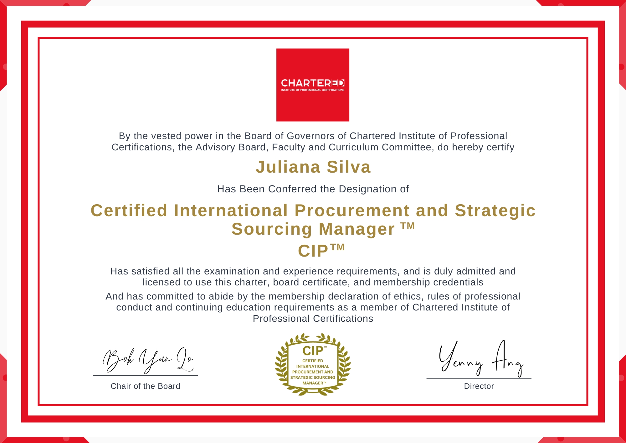 Globally respected and increasingly in demand, the certification validates your expertise in managing international procurement, strategic sourcing, supplier relationships, cost optimization, and risk mitigation across complex global supply markets. It affirms your ability to design and execute robust procurement frameworks, lead high-impact sourcing initiatives, and deliver sustainable commercial value. This program is developed by Chartered Institute of Professional Certifications and the content of this program has been certified by CPD Certification Service as adhering to highest standards of continuing professional principles.