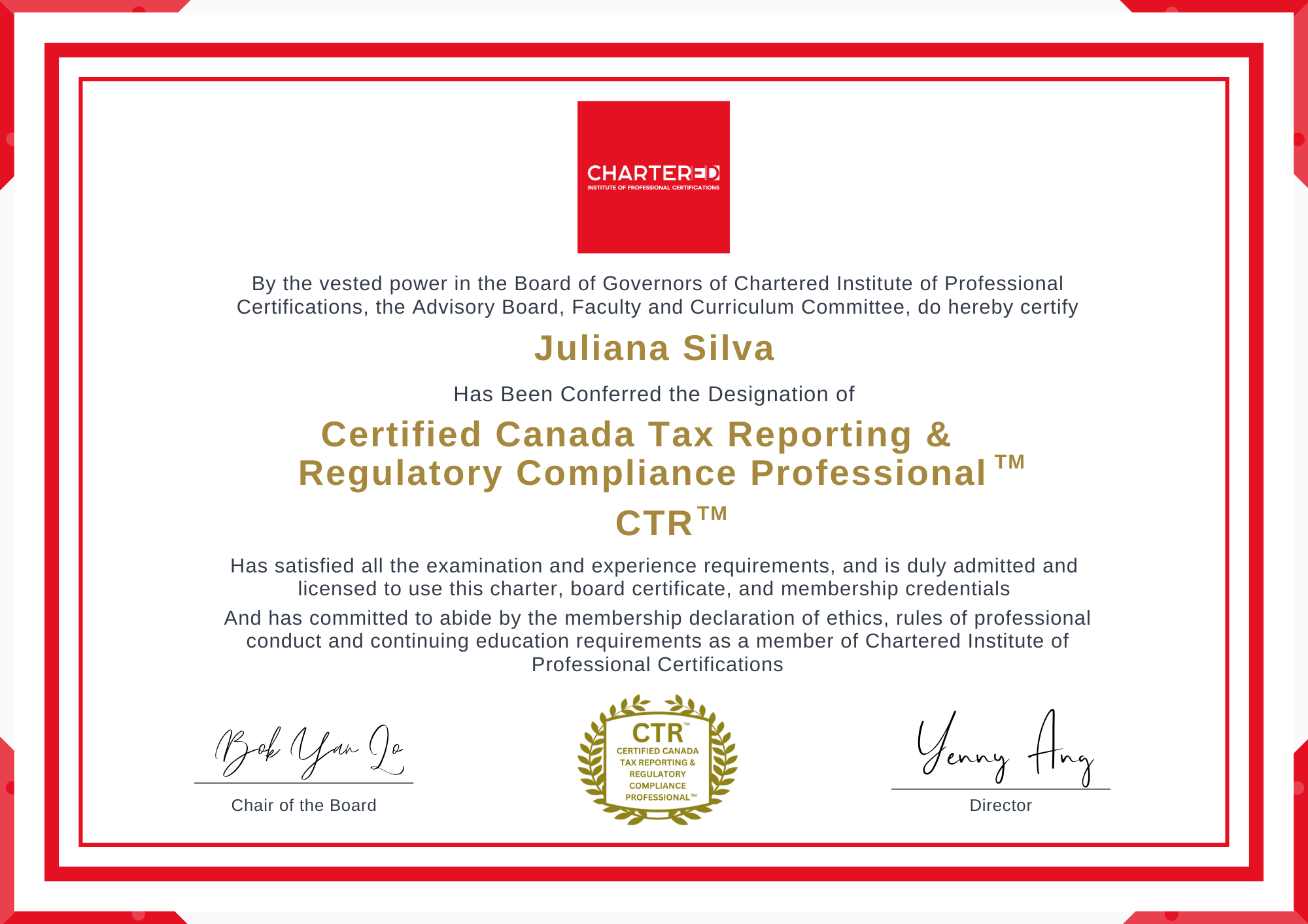 Upon successfully completing this program, you will be awarded the Certified Canada Tax Reporting & Regulatory Compliance Professional (CTR™) designation, which you may use on your resume, CV, LinkedIn profile, and other professional credentials. This certification is industry-recognized and carries lifelong validity.